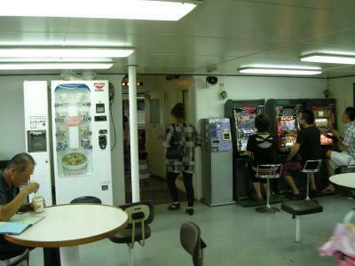 船内に売店はありませんが、カップ麺の自販機とプチゲームコーナーがあって、早速ゲーム機は埋まってました。 |
